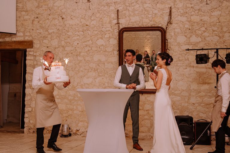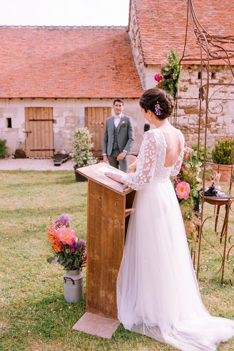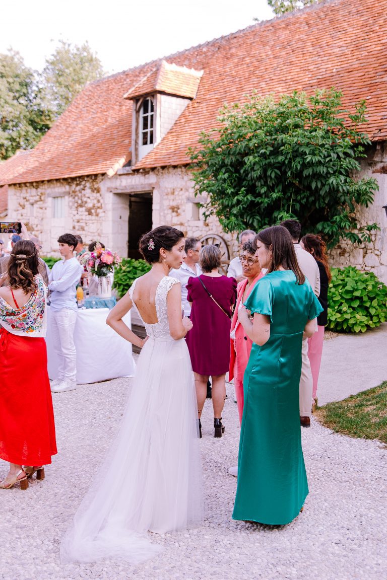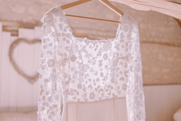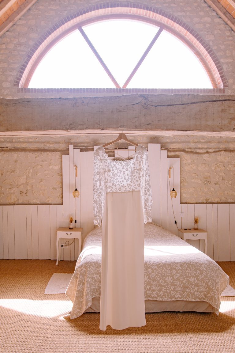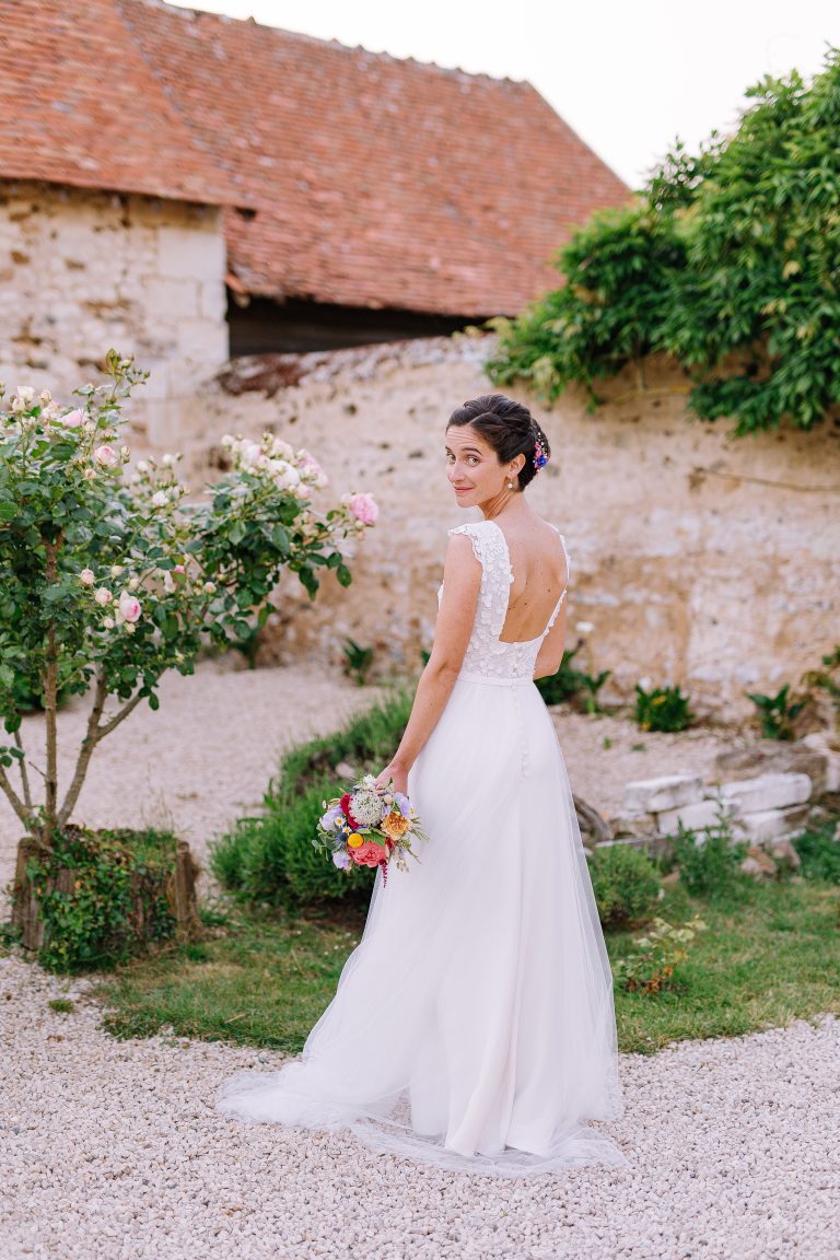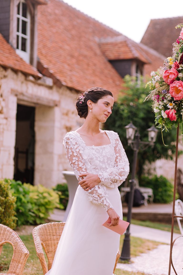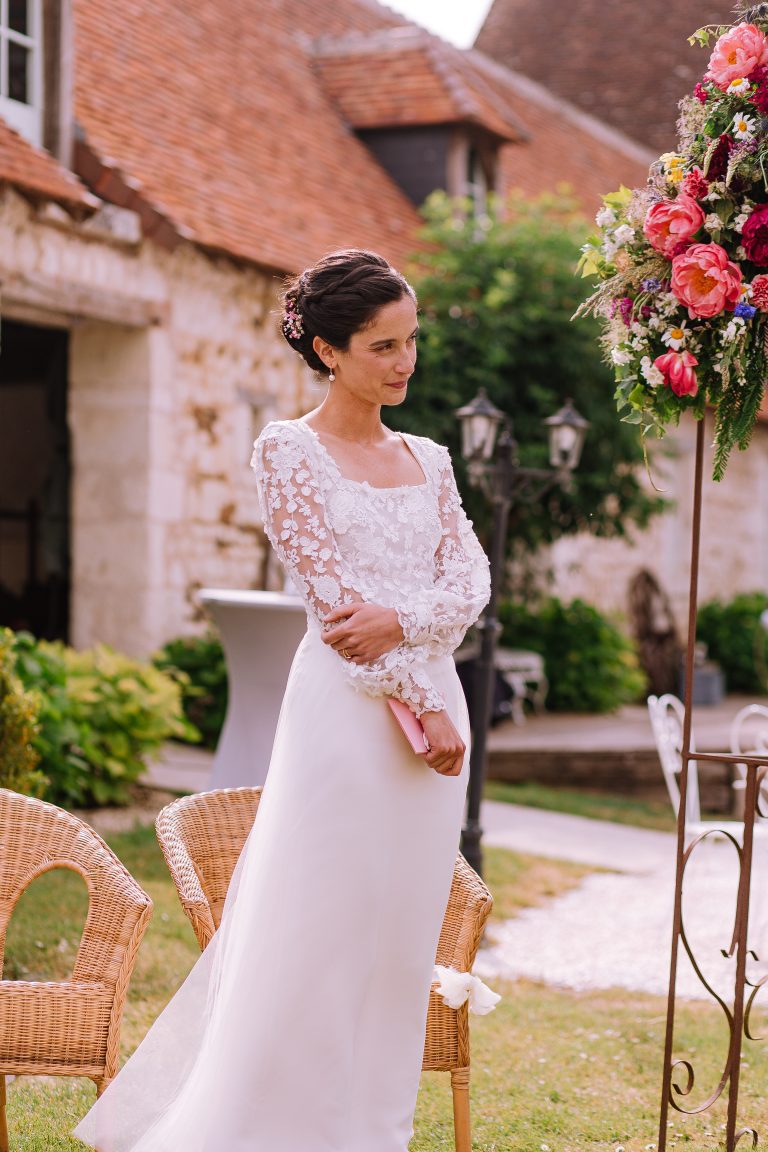 Isaure, c’est un mélange de douceur, de gaieté et d’élégance naturelle. Elle nous a confié la création de sa robe pour son mariage civil ; que nous avons fait évoluer pour qu’elle puisse la reporter pour sa cérémonie laïque, quelques mois plus tard. Ainsi ce n’était pas tout à fait la même robe ! Manches longues et jupe près du corps pour la Mairie ; traîne en tulle pour la cérémonie et enfin sans manches et sans traîne pour faire la fête.