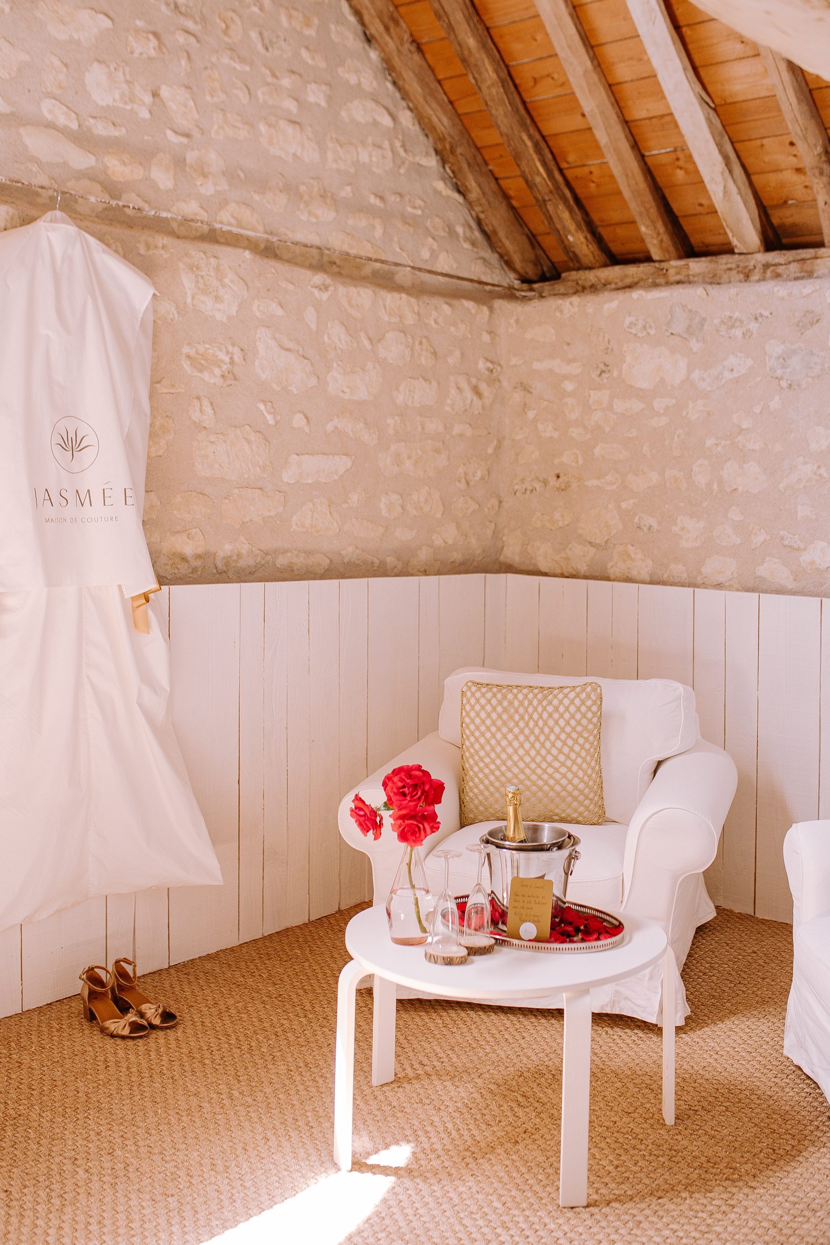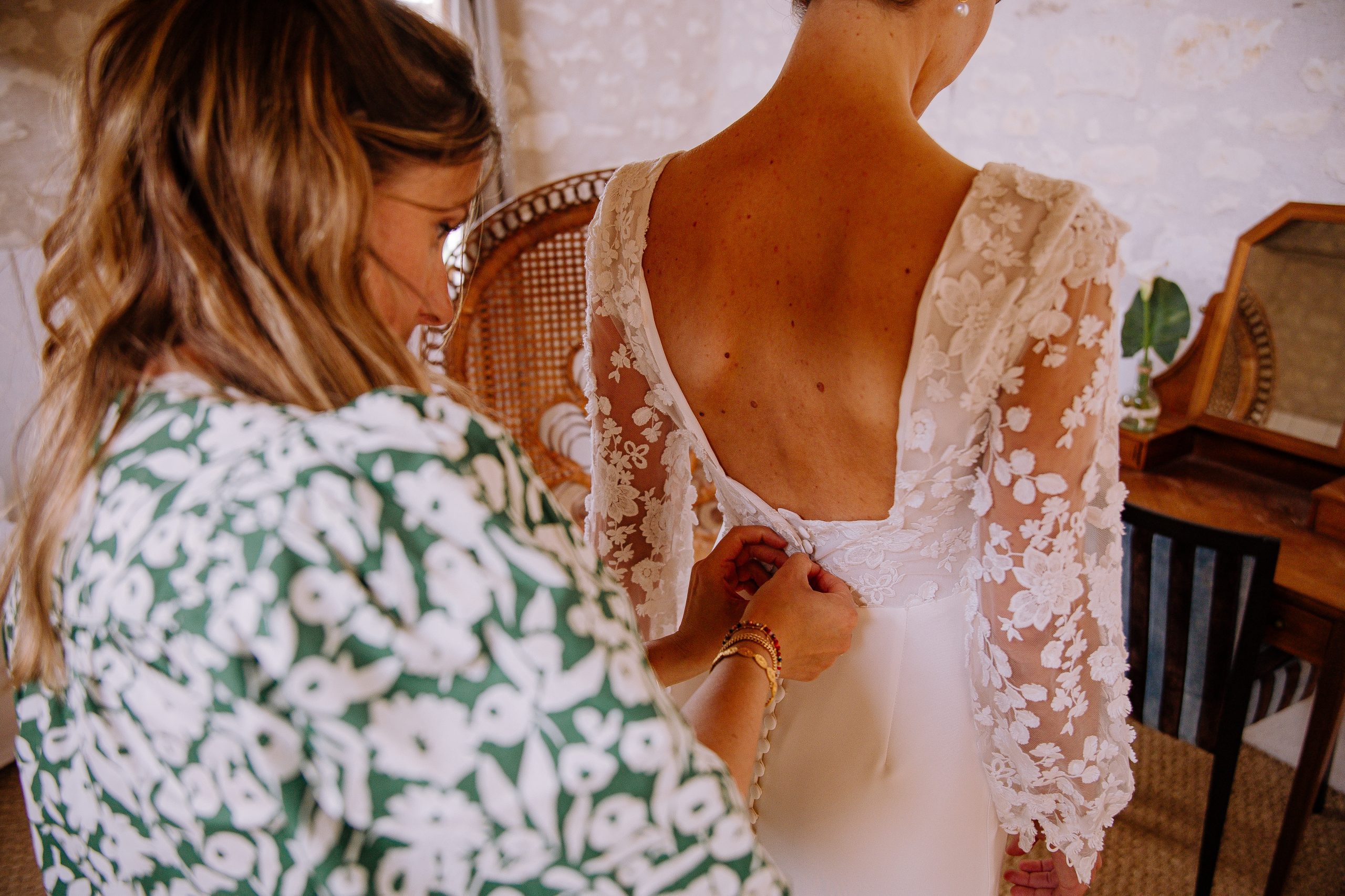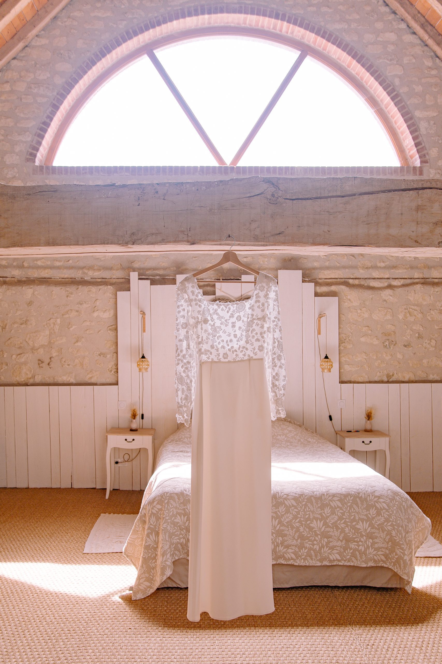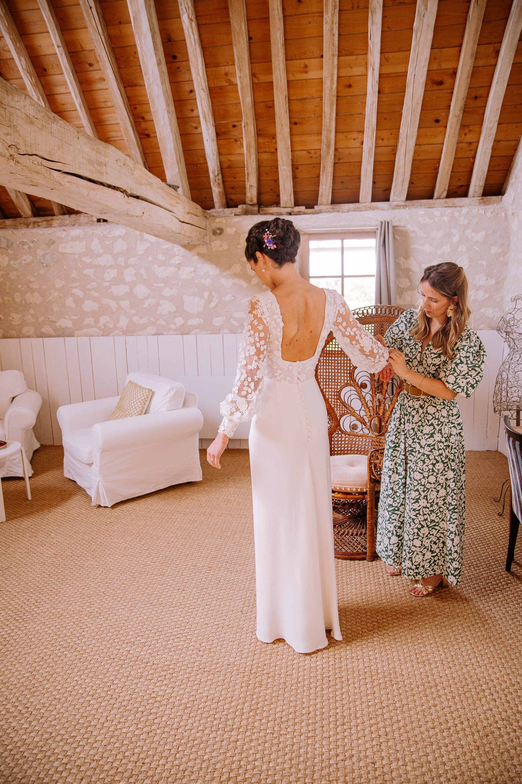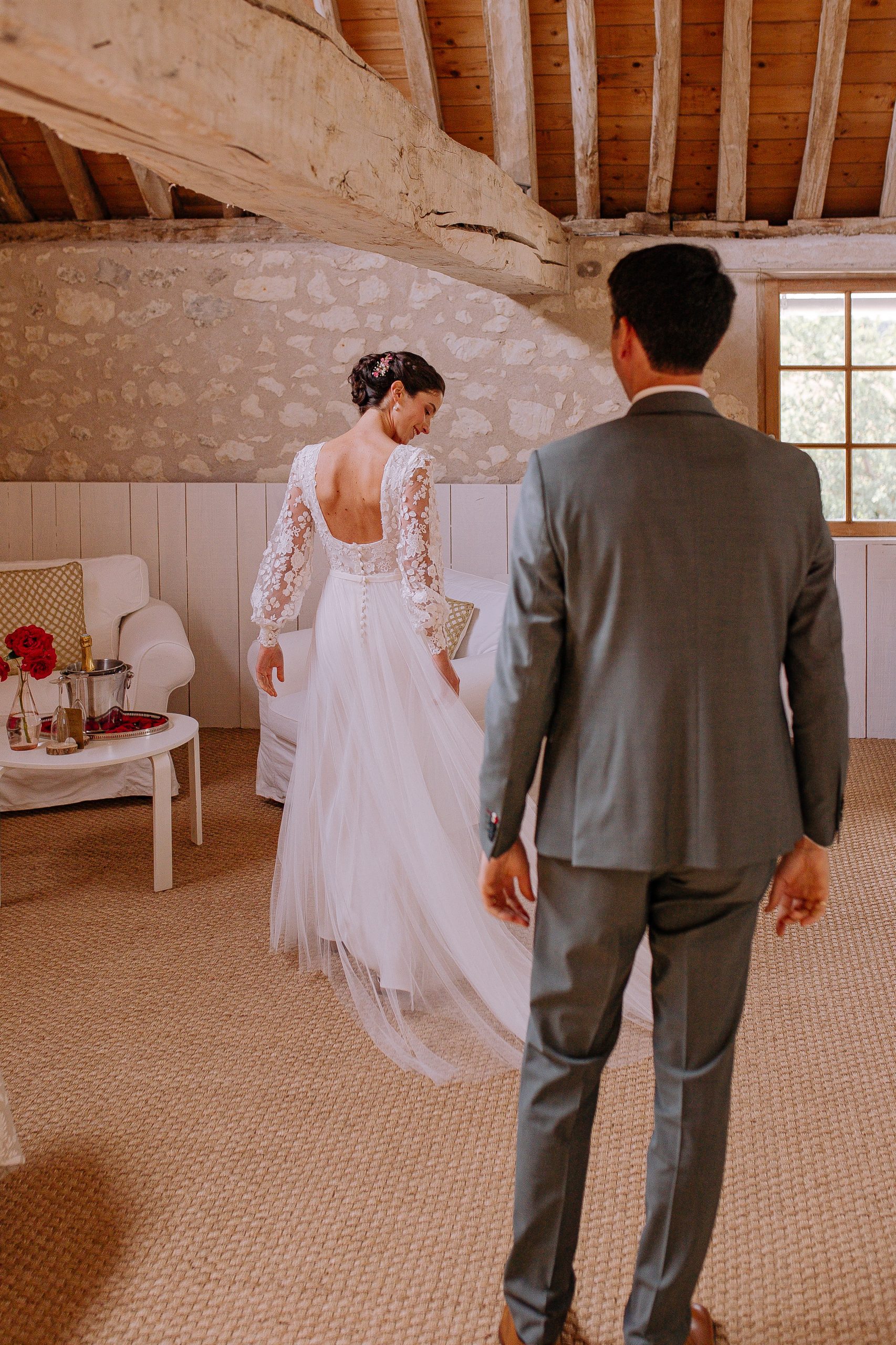 Isaure, c’est un mélange de douceur, de gaieté et d’élégance naturelle. Elle nous a confié la création de sa robe pour son mariage civil ; que nous avons fait évoluer pour qu’elle puisse la reporter pour sa cérémonie laïque, quelques mois plus tard. Ainsi ce n’était pas tout à fait la même robe ! Manches longues et jupe près du corps pour la Mairie ; traîne en tulle pour la cérémonie et enfin sans manches et sans traîne pour faire la fête.