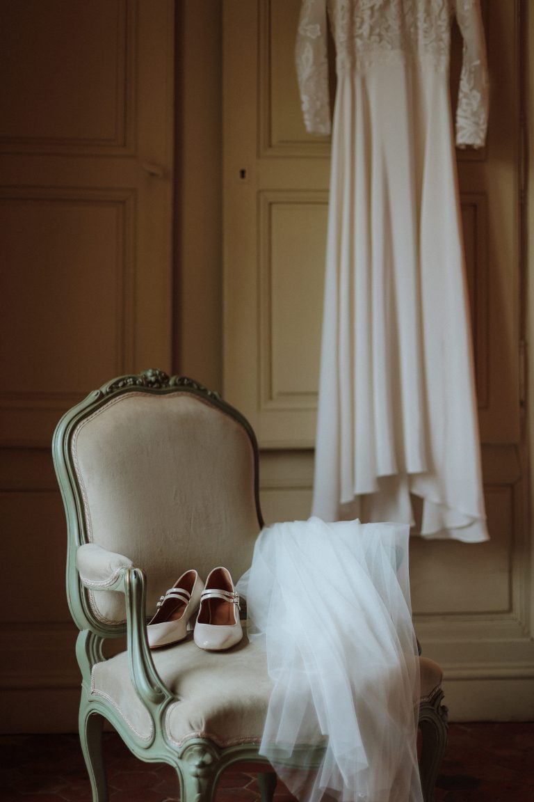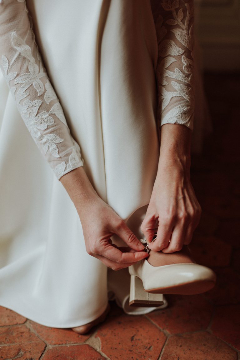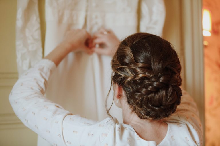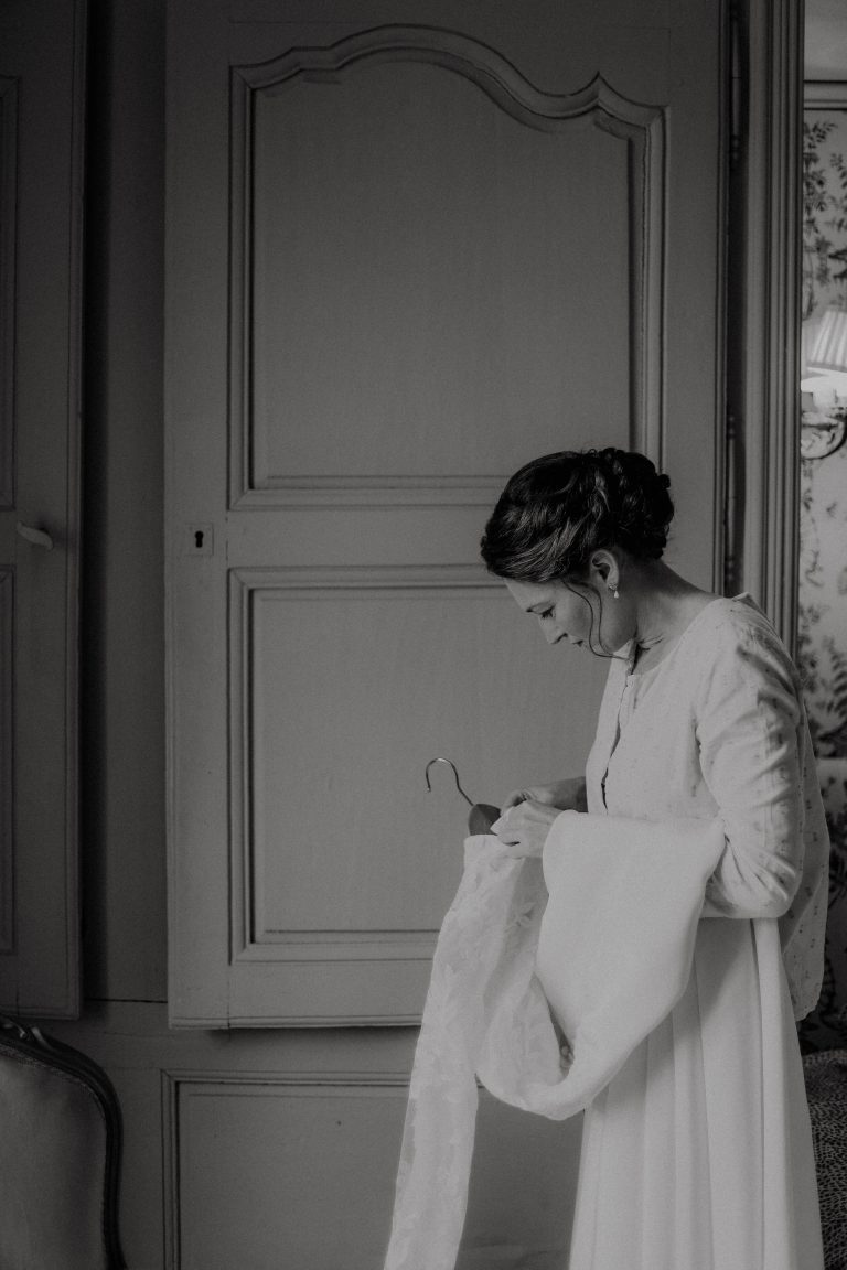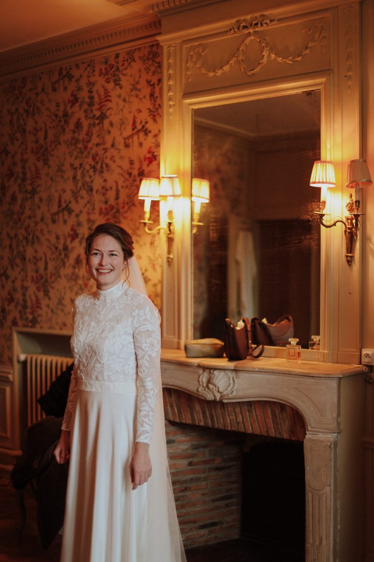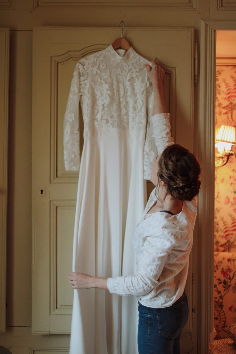 Marion s’est mariée le 31 décembre dernier, une date festive dont tous ses invités se rappelleront ! Assez discrète et un peu frileuse, elle souhaitait une robe évasée en drap de soie et en tulle brodé, doublée de crêpe Georgette pour la réchauffer. Tellement élégante !